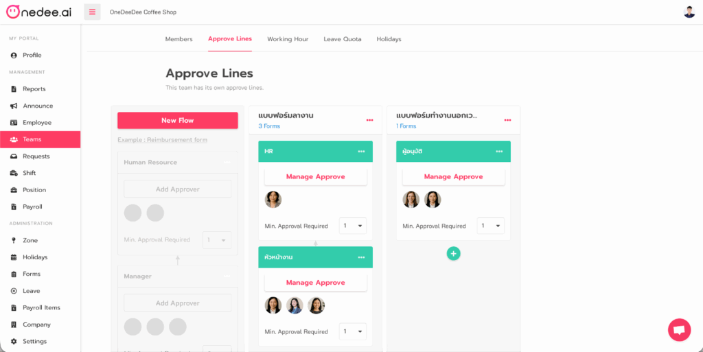 ระบบสามารถกำหนดเงื่อนไขการอนุมัติ ไม่ใช่แค่ให้ต่างกันสำหรับคำขอแต่ละประเภท แต่ให้แตกต่างกันสำหรับแต่ละทีมด้วย ซึ่งระบบสามารถสร้างทีมย่อยได้ไม่จำกัด ตามแผนก สาขา หรือประเภทพนักงาน เพื่อให้ตรงกับนโยบายการอนุมัติของบริษัท